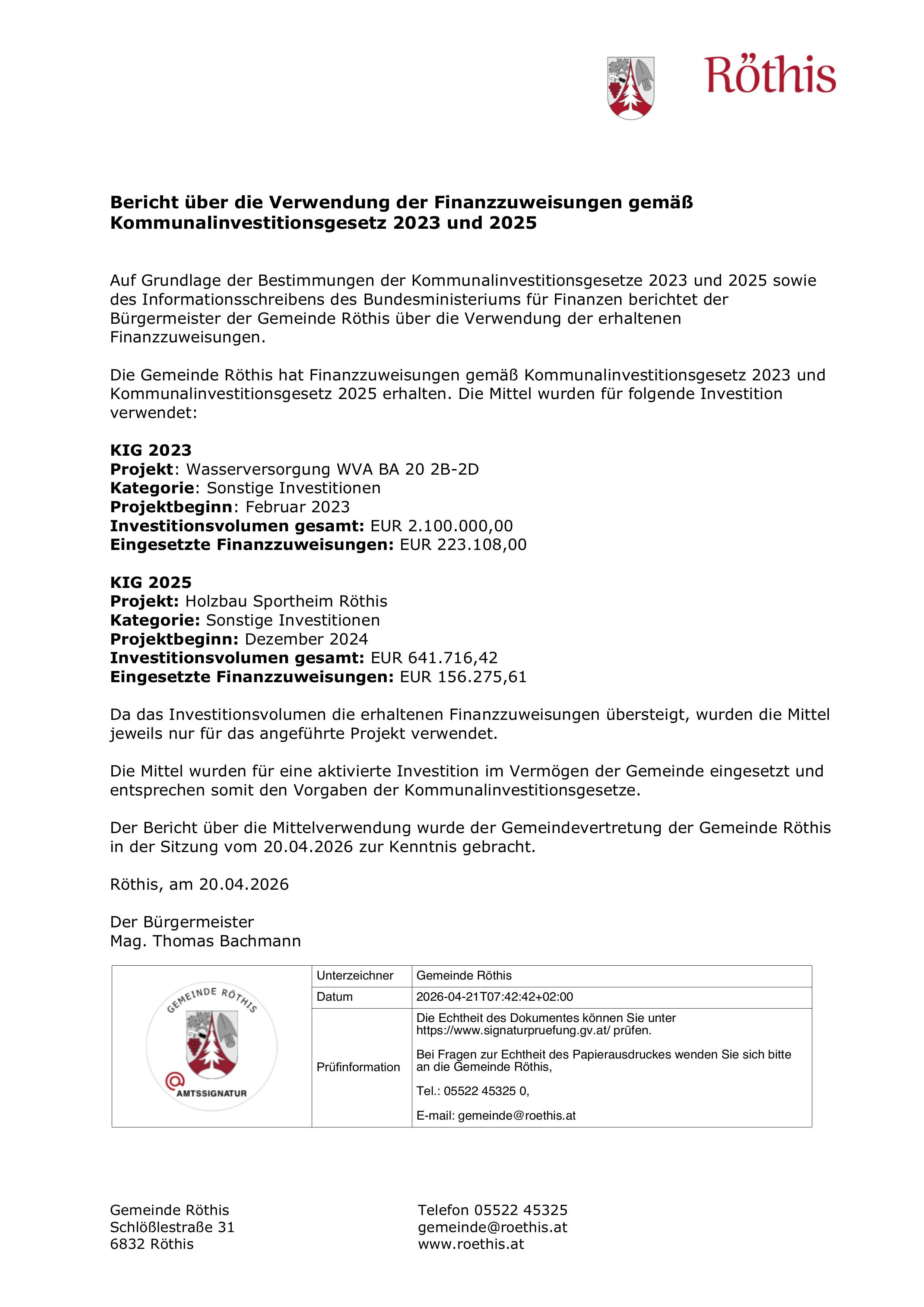 Bericht über die Verwendung der Finanzzuweisungen gemäß Kommunalinvestitionsgesetz 2023 und 2025